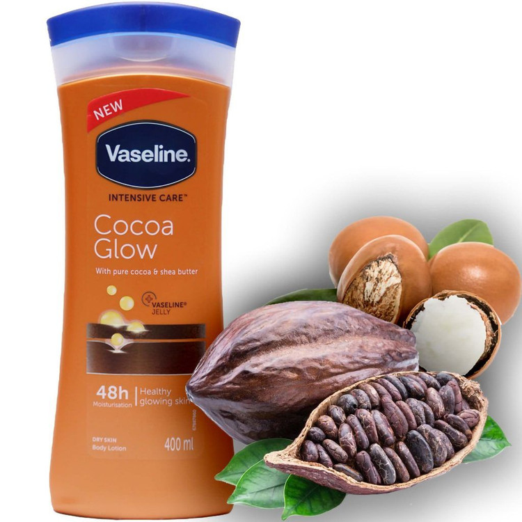 با استفاده از این لوسیون بدن نرم کننده کاکائو، پوست شما به خوبی نرم میگردد. تابش نور رنگ پوست را منعکس کرده و به آن رنگی طبیعی و شگفت انگیز میدهد. حمام های روزانه به طور خارق العاده ایی چربی های محافظت کننده پوست را از بین برده و رطوبت پوست را تبخیر می نماید، اما استفاده از این لوسیون از برند وازلین بعد از حمام رطوبت پوست را برگرداننده و از آن محافظت می کند و مانع کدر شدن پوست میشود و درخشندگی طبیعی پوست را نمایان میسازد. پس از مصرف این محصول پوست لطیف و نرم شده و مرطوب میماند. مواد تشکیل دهنده این محصول روغن کاکائو و گیاه شی میباشد.